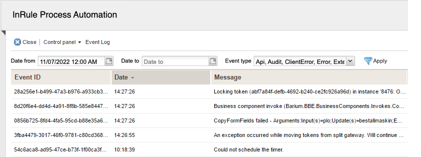 In the application event log, administrators that have access to the process application can view a record regarding the instances running in the process application. This can be useful when something is wrong with the configuration of a process. It is also helpful for you to be able to access this information when speaking to Process Automation Support.