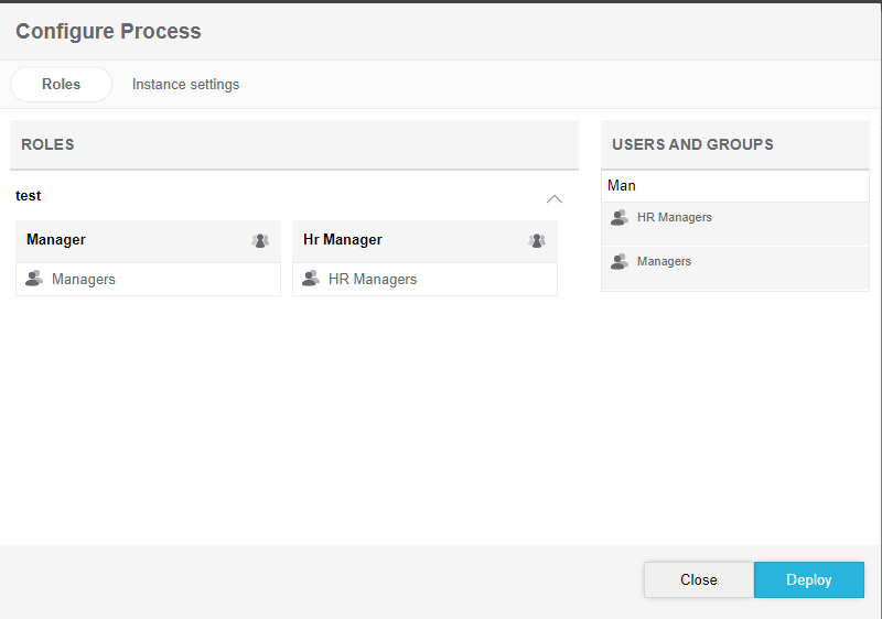 In the example below we have two roles: Manager and Hr Manager. These roles are configured with two groups: Managers and HR Managers.