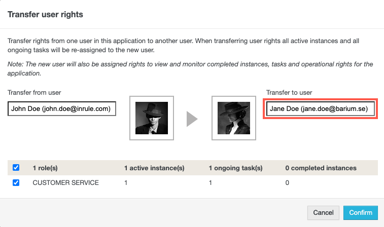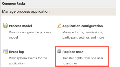 This feature allows application administrators to replace one user in an application with another user by transferring all instance and task permissions from one user to another. It is also possible to transfer a user's permissions in a specific role to another user.