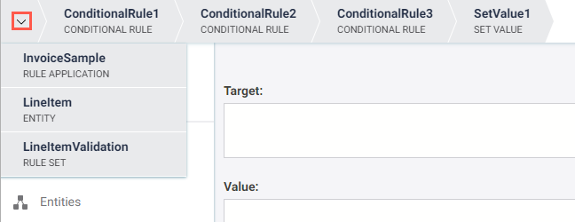 When the breadcrumb gets too long for the horizontal space, there is an arrow that appears in the first section of the breadcrumb that will reveal a drop-down to show the sections that did not fit.