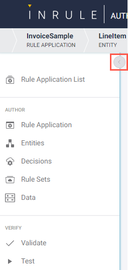 The primary navigation of the page allows you to jump to your desired spot quickly. Items selected will load in the workspace. The core sections are Rule Application List, Author, and Verify.