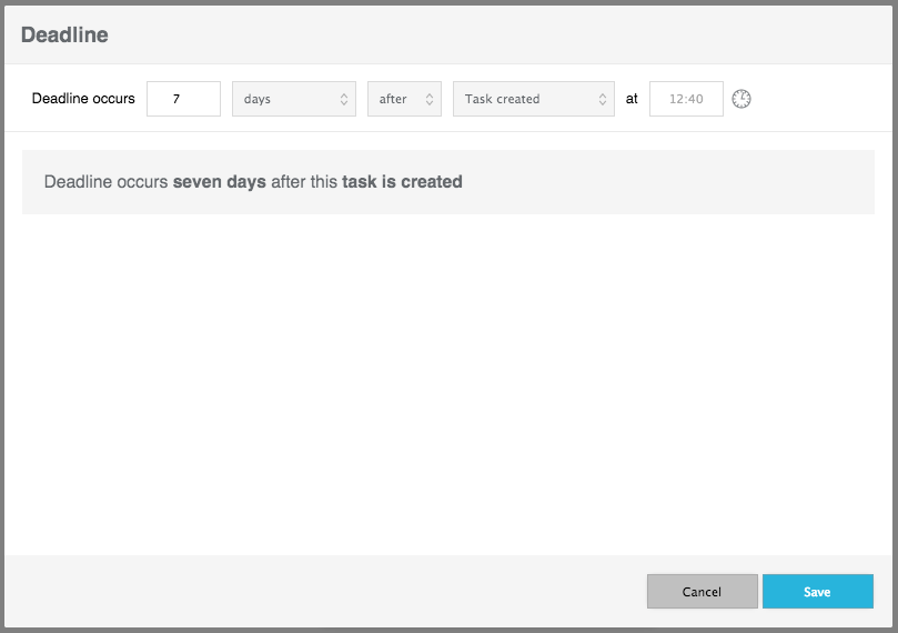 If your process is depending on the user tasks being completed on time you can add Task deadlines. The deadlines can help the users prioritize their tasks and get an overview of their performance when looking at lists.