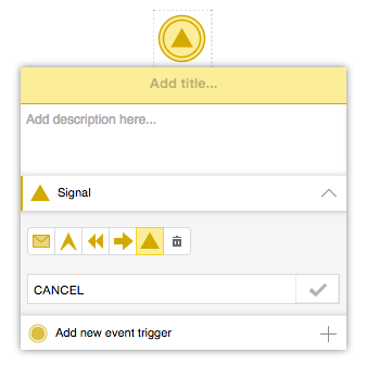 Specify the name of the Signal that you want to send (throw) or listen for (catch). In the example below, the throwing intermediate signal event is configured to send the signal CANCEL_. _