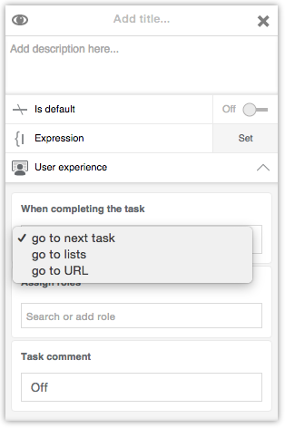 When completing the task is a setting that allows you to configure if the user should be redirected to Lists, sent to the next Task, or redirected to a specific URL after the Task has been completed.