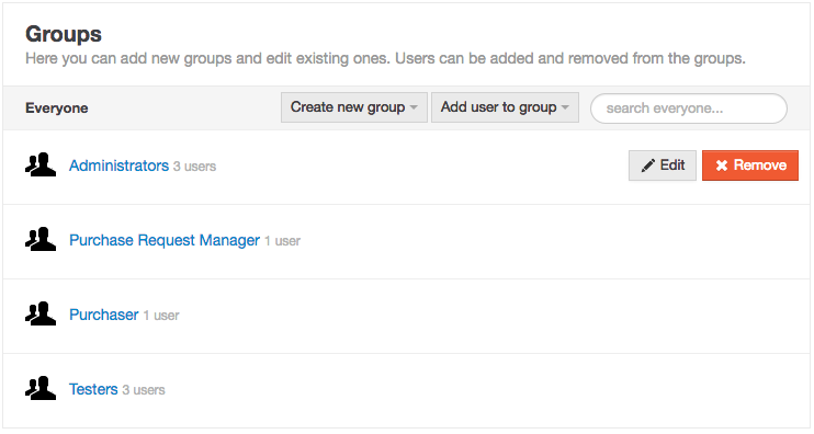 To delete a group, hover over the group you wish to delete and select Remove. The group and all its subgroups will be deleted. All of the users in that group will still continue to be members in the space, but any process models or apps that used the deleted group will no longer have the group connected to it.