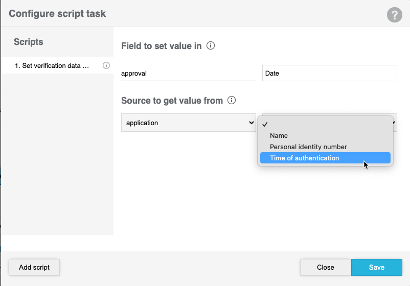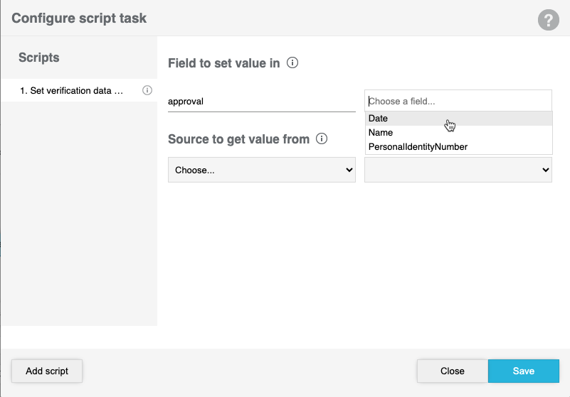 - In the Configure script task window under the Field to set value in section, select the field that will be completed with the information from the BankID authentication.