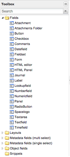 Expand the Fields folder to view the available form fields. The predefined fields available in the list can be seen here. Different fields have different attributes which allow them to hold different types and amounts of information. For example, Numberfield will only allow users to enter numeric characters. Attachment will allow the user to upload a document to the form.