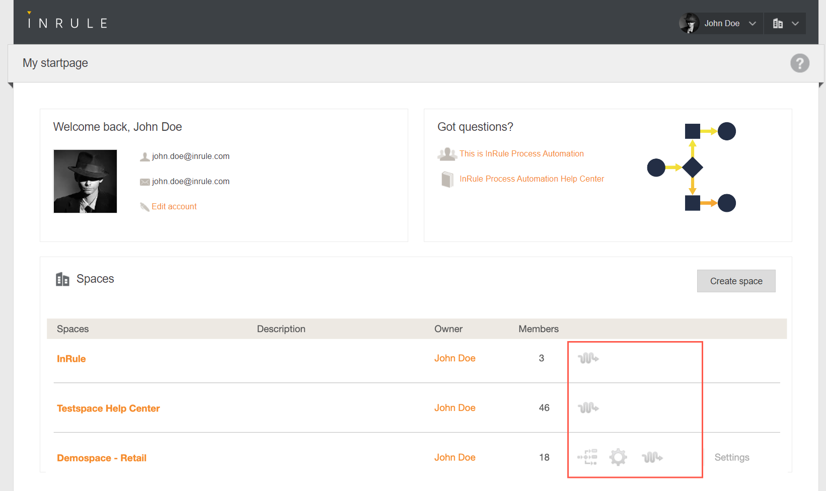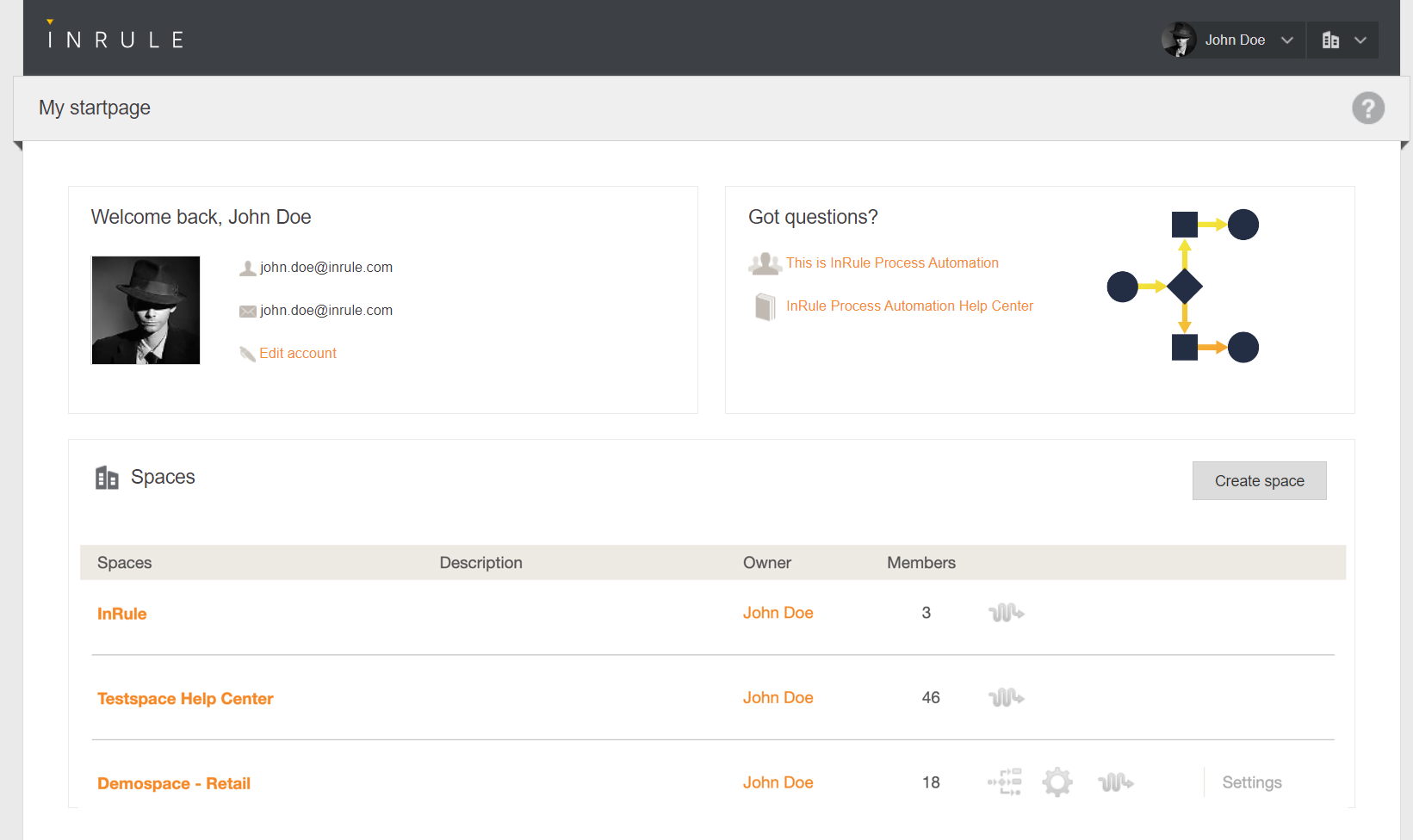 My Startpage can be found in the spaces menu in the top right corner. This is where you see information about your account. In the Got Questions section, you can find links to the Help Center and an opportunity to get in contact with Process Studio experts.