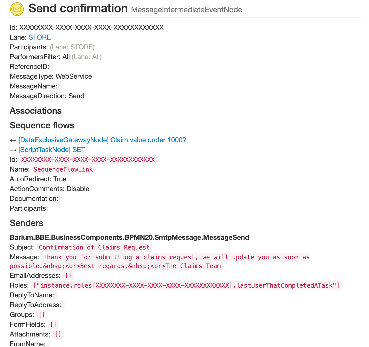 Message events If you have a process that is sending out emails, you can check the mail configuration from the process documentation page.