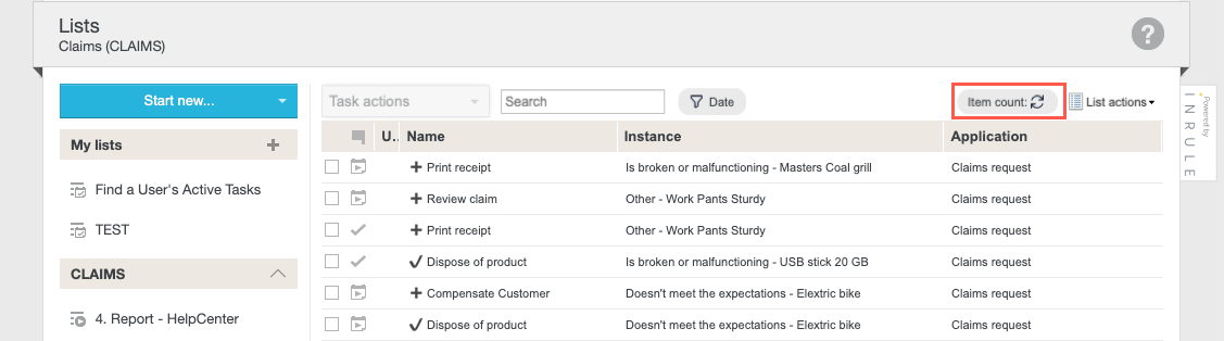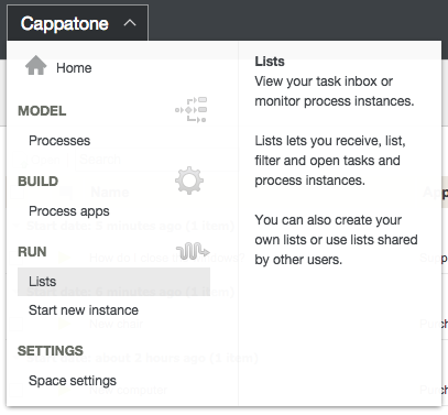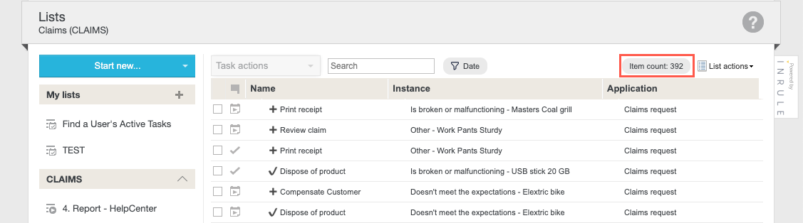 In the Lists view, you will find your My tasks list which functions like an inbox where you can perform tasks and monitor process instances. You can also create your own list and use lists shared with you by other users.