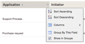 When hovering over a column header, another arrow appears. When clicking on it you find sorting and grouping options. The default setting groups the list by date, and sorts it descending by date. Often it is useful to select Group By This Field on the Application column or use the filter Sort Ascending, for example. If you select one of these filters, it will remain on the list until you log out.