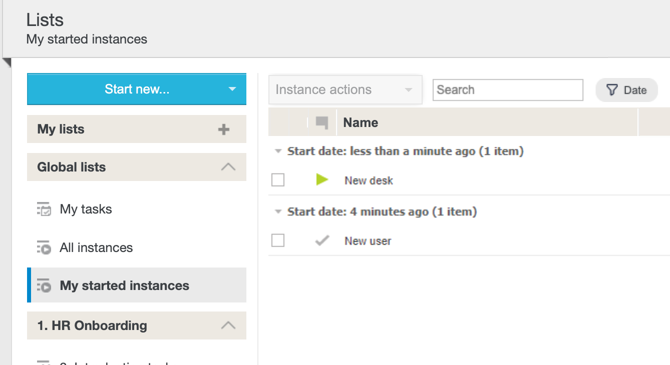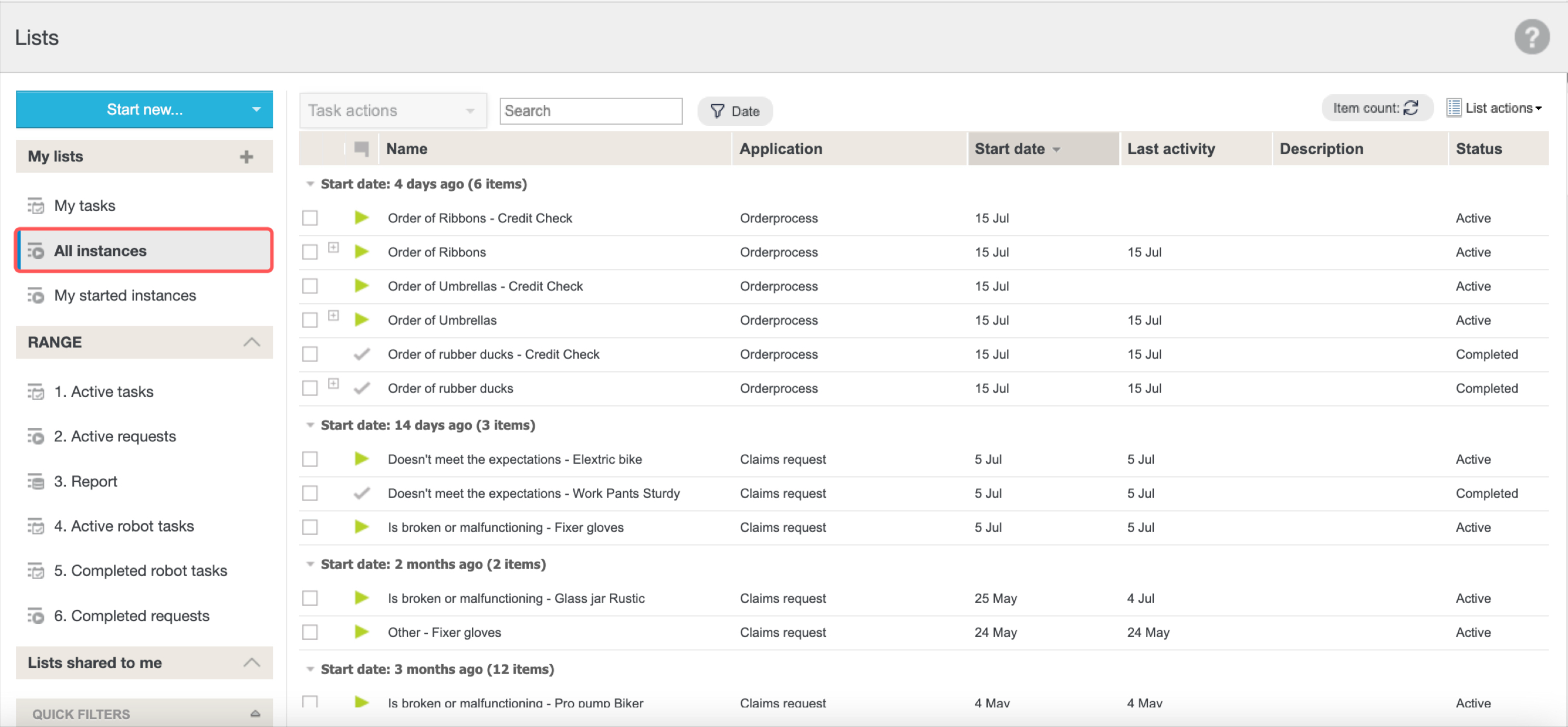 Under All instances, you will find all instances, completed and ongoing, that you have been involved in and for applications where you have at least a monitoring role. This is a pre-configured list, meaning it is configured automatically if the setting is selected. If you find this view overwhelming because there are many instances in your list, you can create a custom instance lists that is more suited to your individual needs.