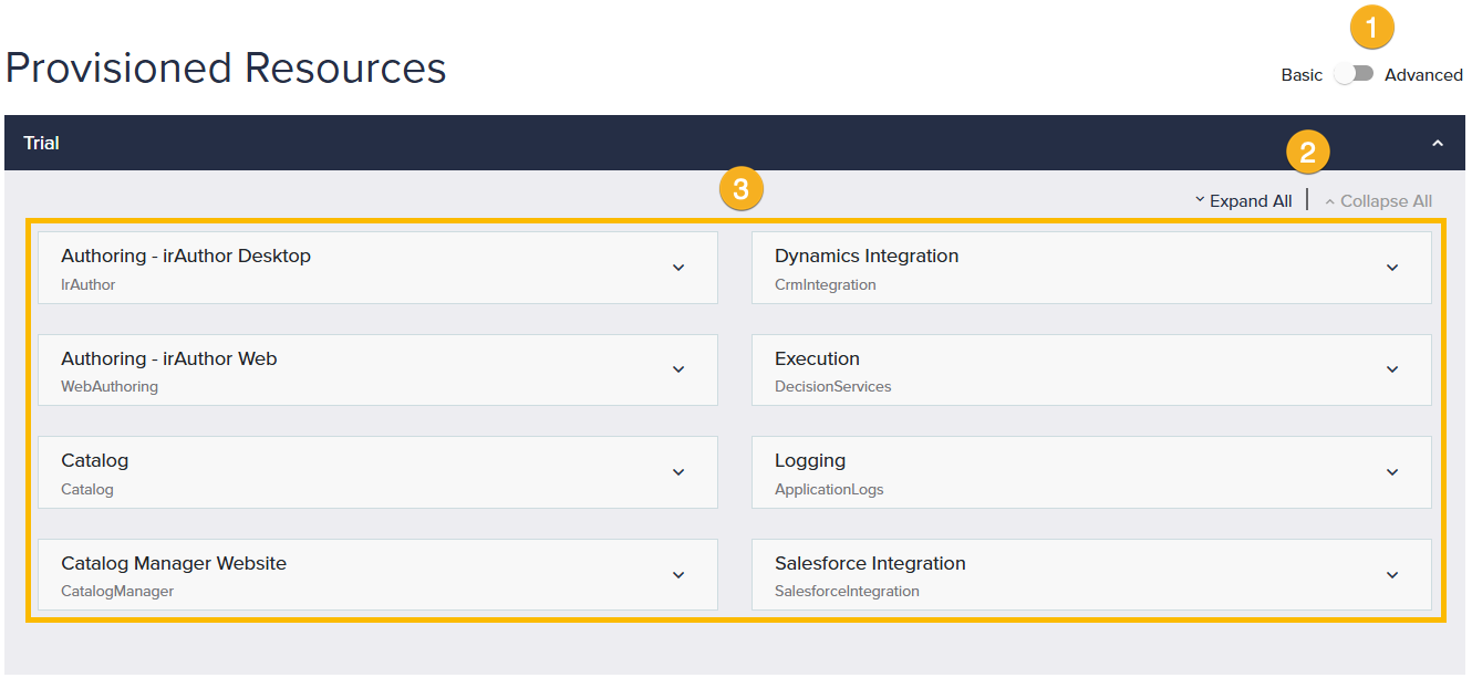 The Provisioned Resources page offers two viewing options: Basic and Advanced. The Basic view provides users with the most commonly required resource information for typical use cases. If advanced configuration access is necessary for certain resources, they will be listed when the toggle is set to Advanced.