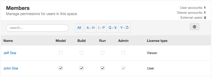 Under the section Members, all users in the space can be administered. Here are all users who accepted an invitation to the space listed and the permissions can be adjusted.