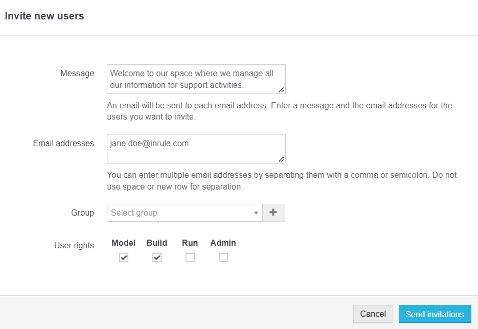 3. Optional: Specify groups that you want the user(s) to be a member of and select the permission rights for the invited user(s). Read the article on User Rights to understand the different types of access you can assign.