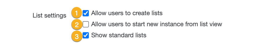 1. Allow users to create lists This is selected as a default. When this is selected it allows all users in a space to create their own lists. Users with Admin privileges can always create lists, regardless if this box is checked or not. 2. Allow users to start new instance from list view