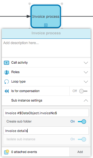 For a sub process or Call Activity, fill in this field and all its sub instances will be named after the text you enter. It is also possible to isolate the sub instance from the main instance by stating a sub folder for all the content of the sub instance.
