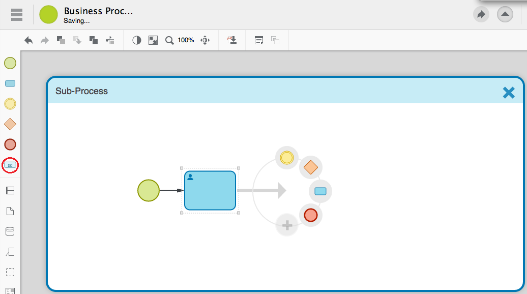 3. Model your subprocess within the enabled window, just the way you normally model with a start task and end symbol. Then close the subprocess window by using the x-sign in the top right. Model_in_Sub_process.png