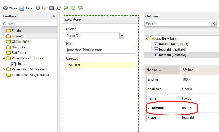 2. In order to reference corresponding columns after making the initial selection in the main field, simply add as many fields as you wish and add the attribute valueFrom and type in the name of the field followed by the name of the column. For example, employees.B