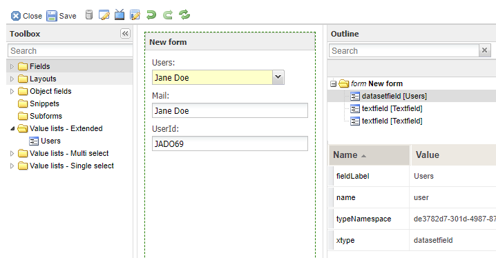 - In order to reference an extended value list, select it from the left side panel and add it to your form canvas just like any ordinary field. The first column will be the default value to be displayed in the field.